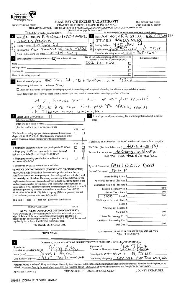 | 1 | 10/31/2018 | SWD | Statutory Warranty Deed | DONALD M IVERSON | ROBERT & JEMALLYN RAMOS | | | $59,000.00 | 131340 | |