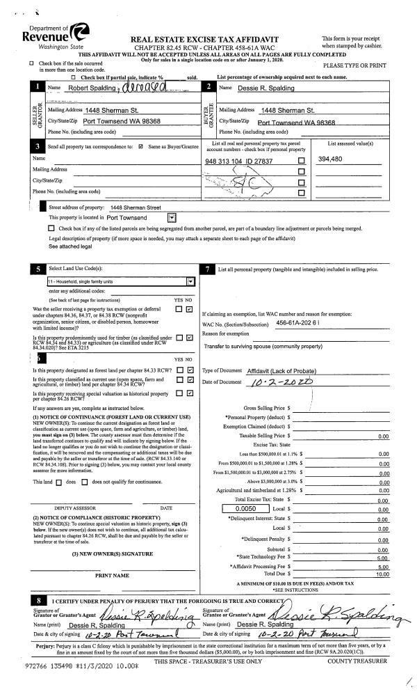 | Mailing Address: | RAMANO REID TRUSTEE DAVID A PORTER TRUSTEE 3705 LARSON LAKE RD PORT LUDLOW, WA 98365-9249 | % Ownership: | 100.0000000000% |