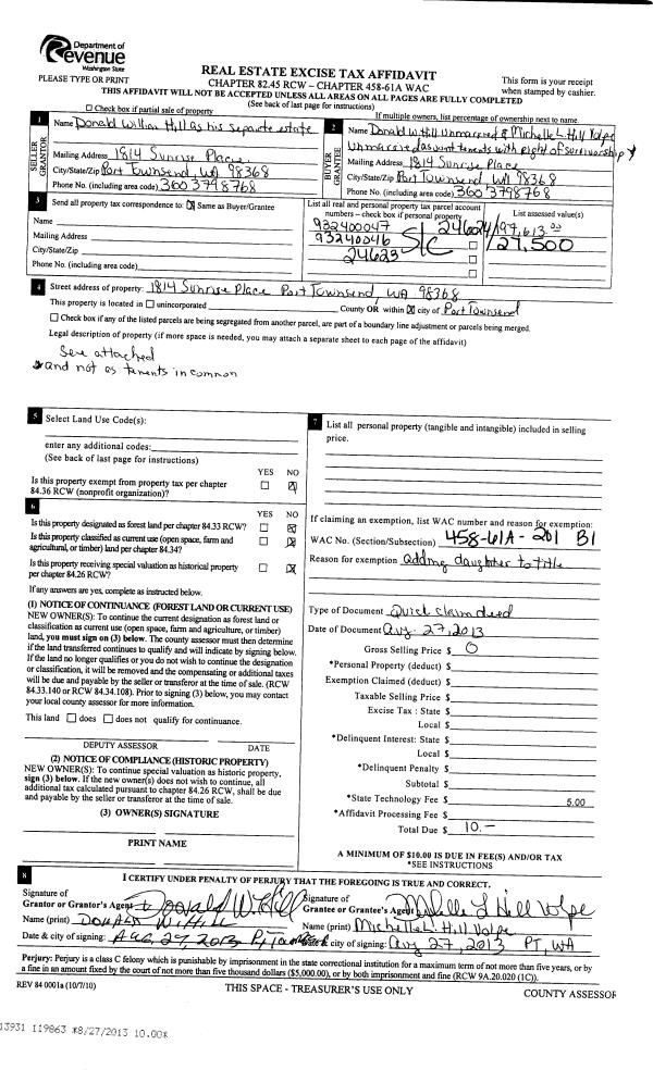 | 1 | 10/08/2014 | SWD | Statutory Warranty Deed | RAYMOND L DIEHL | STATE OF WASHINGTON-DNR | | | $97,000.00 | 122064 | |