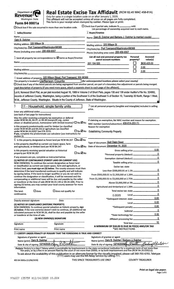 | 1 | 2370-1515F | Low Bank Waterfront along Hood Cnl and Dabob Bay | 0.0000 | 0.00 | 0.00 | 0.00 | 0.00 | $379,500 | $0 |