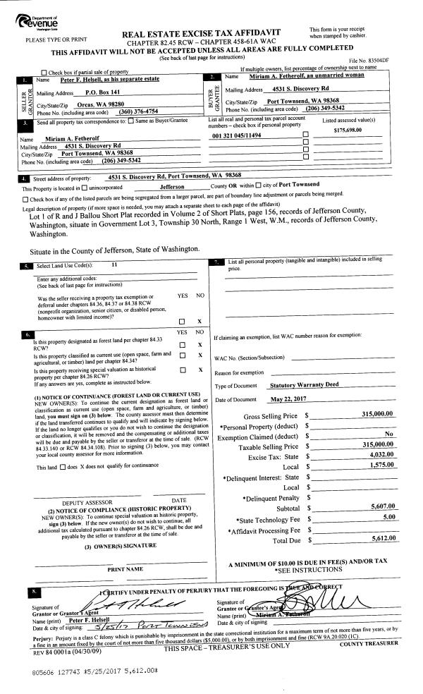 | 1 | 2370-1515F | Low Bank Waterfront along Hood Cnl and Dabob Bay | 0.0000 | 0.00 | 0.00 | 0.00 | 0.00 | $288,075 | $0 |