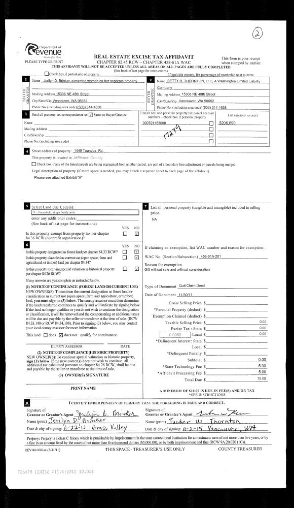 | 1 | 10/13/2016 | SWD | Statutory Warranty Deed | FRED & EDITH LORRAINE PLEINES | STATE OF WASHINGTON-DNR | | | $417,500.00 | 126473 | |