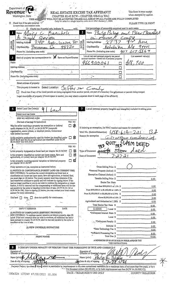 | 2 | 2355-1515F | Low Bank Waterfront along Dabob and Quilcene Bay | 0.0000 | 0.00 | 0.00 | 0.00 | 0.00 | $82,524 | $0 |
