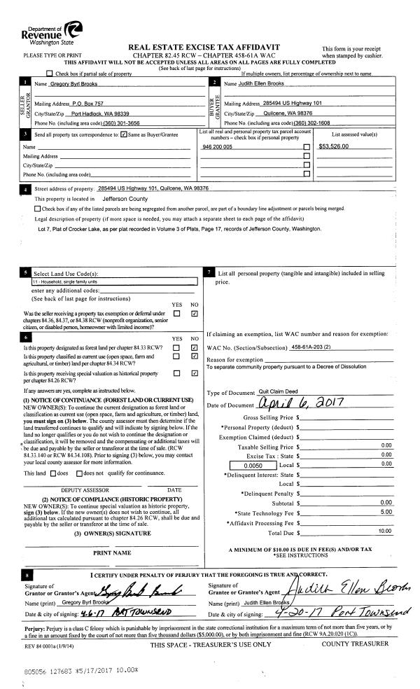 | Mailing Address: | PO BOX 763 QUILCENE, WA 98376-0763 | % Ownership: | 100.0000000000% |