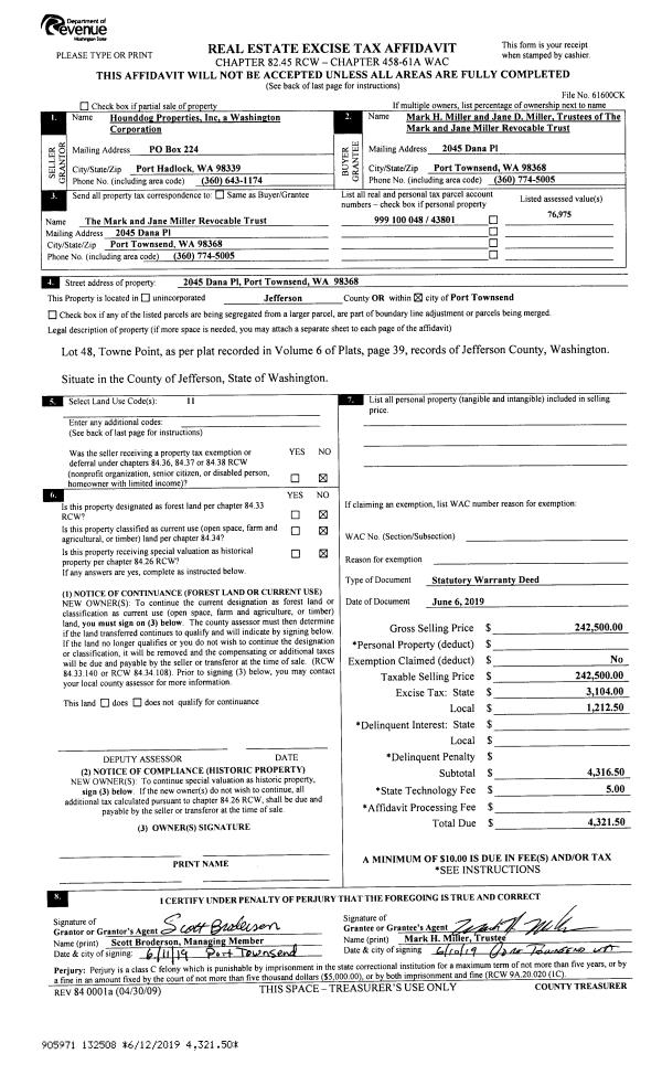 | 2 | 06/02/2014 | SWD | Statutory Warranty Deed | WALTER H PEDERSON | COAST SEAFOODS COMPANY | | | $200,000.00 | 121309 | |