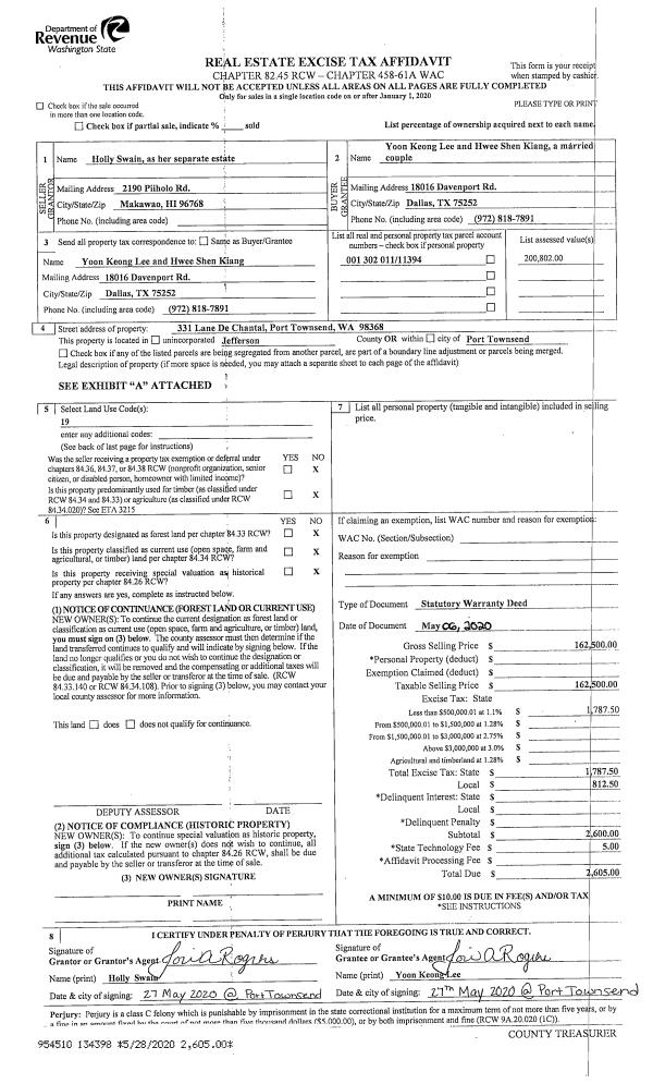 | 3 | 12/04/2006 | SWD | Statutory Warranty Deed | TIMBERHOUSE LLC | BY THE SEA RESTAURANT & CATER | 0 | 0 | $750,000.00 | 108191 | 0 |