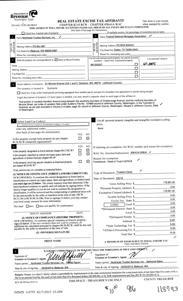 | 2 | 06/02/2008 | SWD | Statutory Warranty Deed | AFS AT-1 INC, A WA CORPOR | BOCHAT, BRIAN/SUSAN | | | $0.00 | 111378 | 0 |