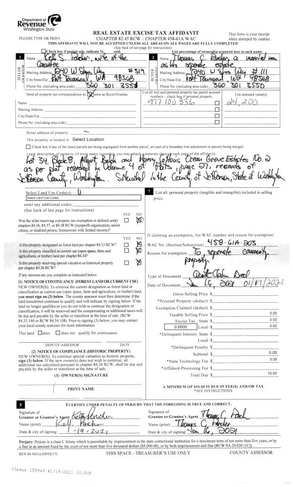 | 1 | 2570-1517F | No/Low Bank Wtrfrt on Quilcene Bay | 0.0000 | 0.00 | 0.00 | 0.00 | 0.00 | $20,821 | $0 |