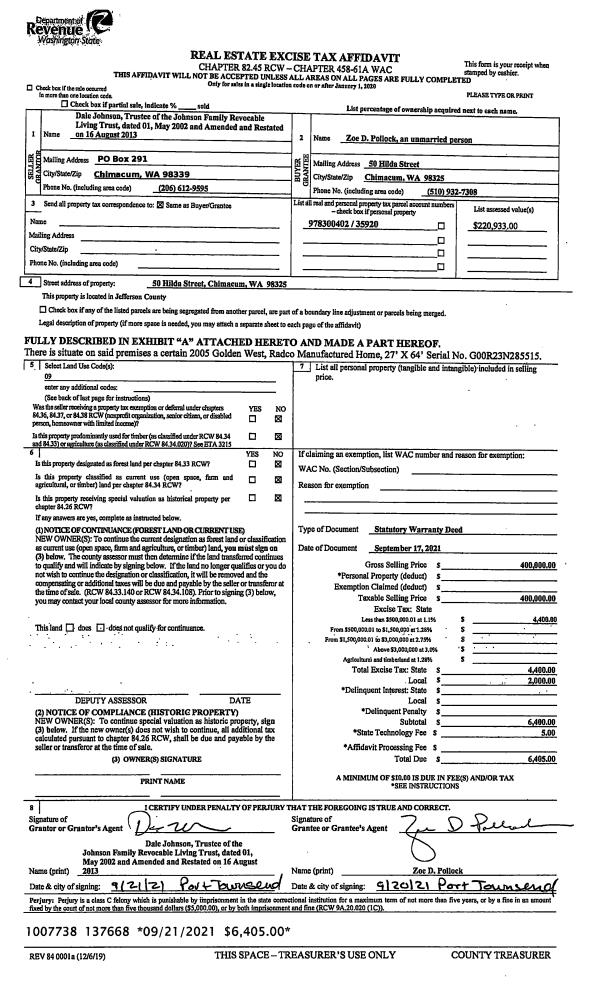 | 1 | 10/08/2020 | SWD | Statutory Warranty Deed | MARILYN M VAN BELLLE SURVIVORS TRUST | PAUL J & ROBIRDA M LYON REVOCABLE LIVING TRUST | | | $1,100,000.00 | 135751 | |