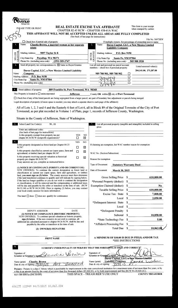 | Mailing Address: | EDWARD L DAVIS TRUSTEE SARA S DAVIS TRUSTEE 1254 SHINE RD PORT LUDLOW, WA 98365-9511 | % Ownership: | 100.0000000000% |