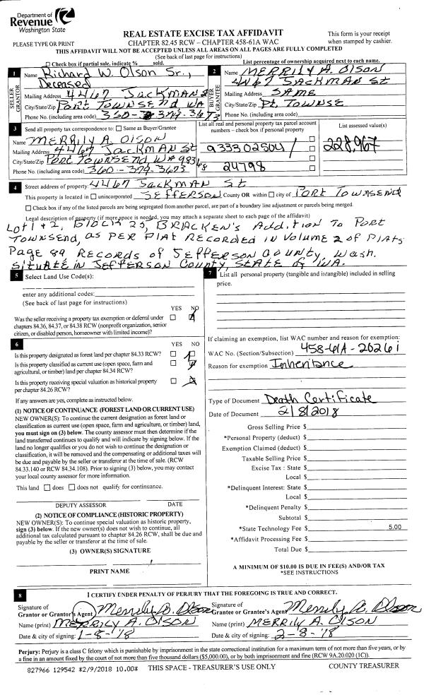| 1 | 07/27/2018 | PRD | Personal Representatives Deed | JEFFREY J CURTIS | JANICE E CURTIS | | | | 130728 | |