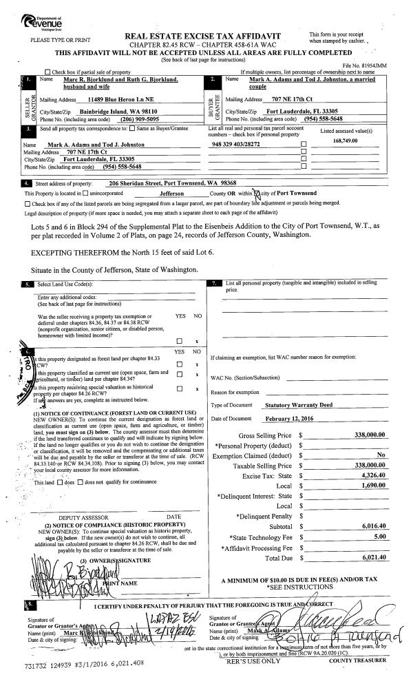 | 2 | 07/15/2008 | SWD | Statutory Warranty Deed | HADLOCK CHIMACUM INTERCHA | KINNEY, ROBERT J | | | $139,000.00 | 111637 | 0 |