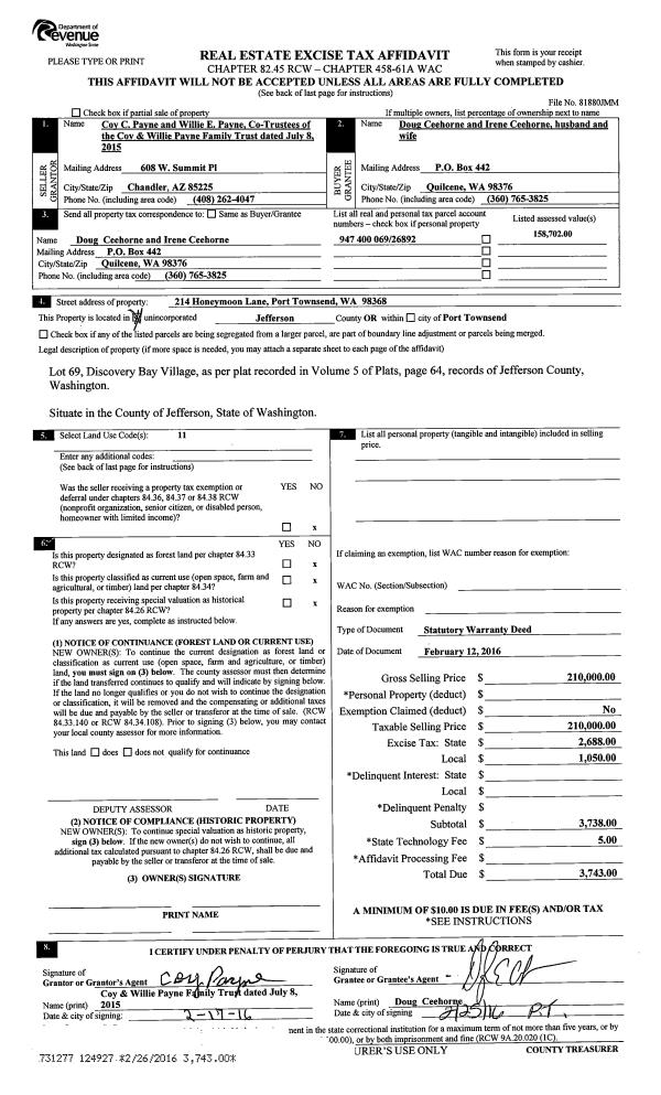 | Mailing Address: | 46 VILLAGE WAY PMB 107 PORT LUDLOW, WA 98365-5102 | % Ownership: | 100.0000000000% |