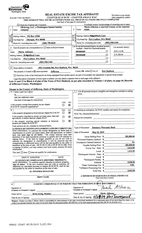 | 2 | 11/06/2019 | SWD | Statutory Warranty Deed | OPG PROPERTIES LLC | CLEAVER WOOD PROPERTIES | | | $1,100,000.00 | 133460 | |