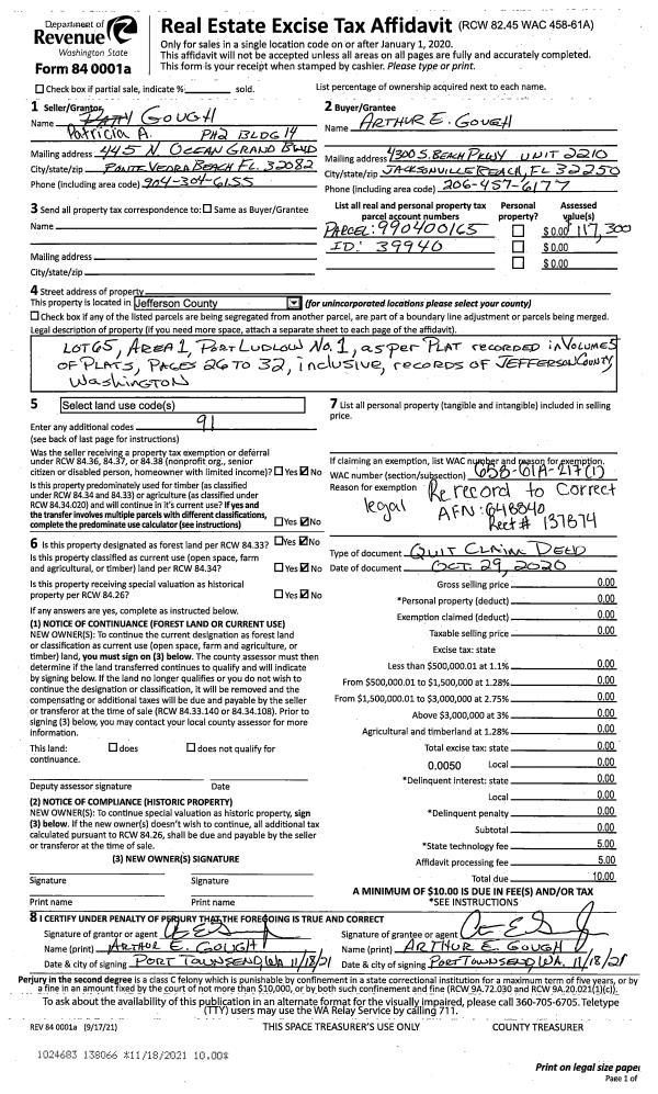 | 1 | 12/11/2001 | BLA | Boundary Line Adjustment | DORSEY, MARK R, PORT LUDL | DORSEY, MARK R, PORT LUDLOW AS | 0 | 0 | $0.00 | 93654 | 0 |