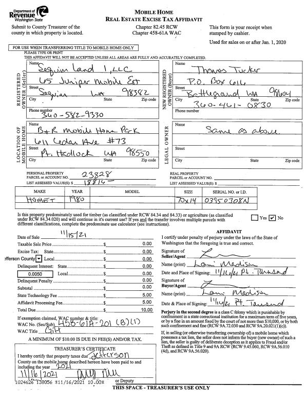 | Mailing Address: | 21 SHINE RD PORT LUDLOW, WA 98365-9509 | % Ownership: | 100.0000000000% |