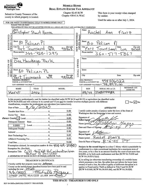 | Mailing Address: | 203 SHINE RD PORT LUDLOW, WA 98365-9275 | % Ownership: | 100.0000000000% |