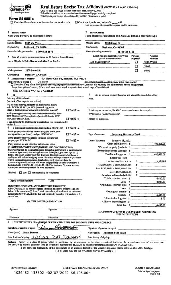 | Mailing Address: | 167 BRIM RD ONALASKA, WA 98570-9505 | % Ownership: | 100.0000000000% |