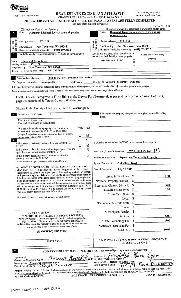 | Mailing Address: | 103 RIVER RUN RD SEQUIM, WA 98382-8265 | % Ownership: | 100.0000000000% |