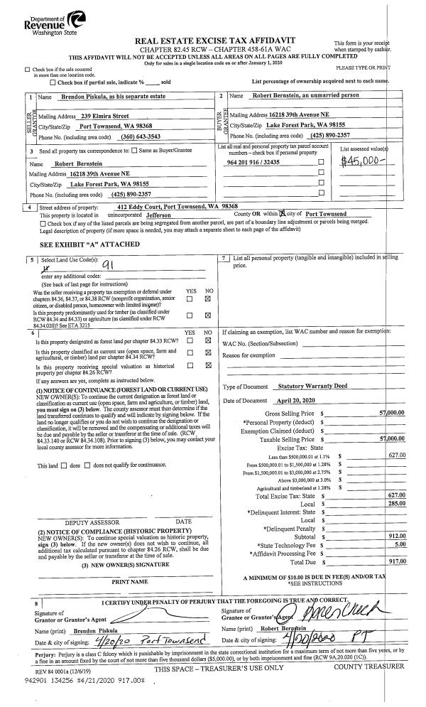 | 1 | 03/02/2015 | BSD | Bargain and Sale Deed | VINCENT PEER AUGUST HUBNER | LANI A & JOE BARTLETT | | | $57,500.00 | 122791 | |
