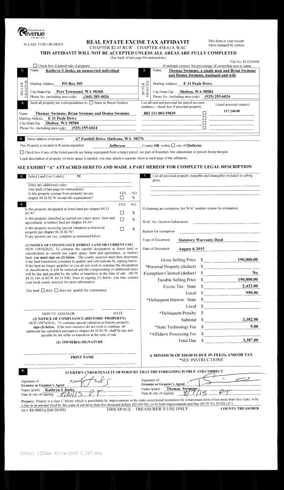 | 1 | 07/09/2015 | SWD | Statutory Warranty Deed | WILDS REVOCABLE LIVING TRUST | WILLIAM & JILL RICHEY | | | $500,000.00 | 123520 | |