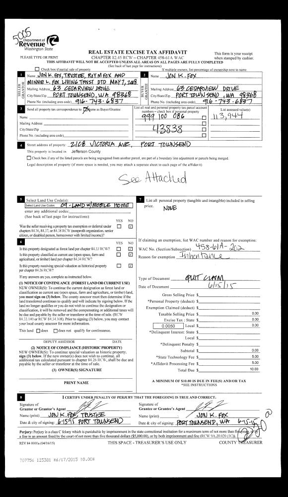 | Mailing Address: | JANICE L MYHRE TRUSTEE D & J MYHRE LIVING TRUST 247 OLYMPIC RIDGE DR PORT LUDLOW, WA 98365-9555 | % Ownership: | 100.0000000000% |
