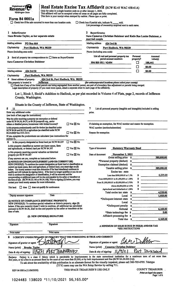 | 2 | 05/19/2022 | EASE | Assignment of Easement | HADLOCK DEVELOPMENT COMPANY | JEFFERSON COUNTY | | | $2,623.00 | 139138 | SEW/UTIL EASE |