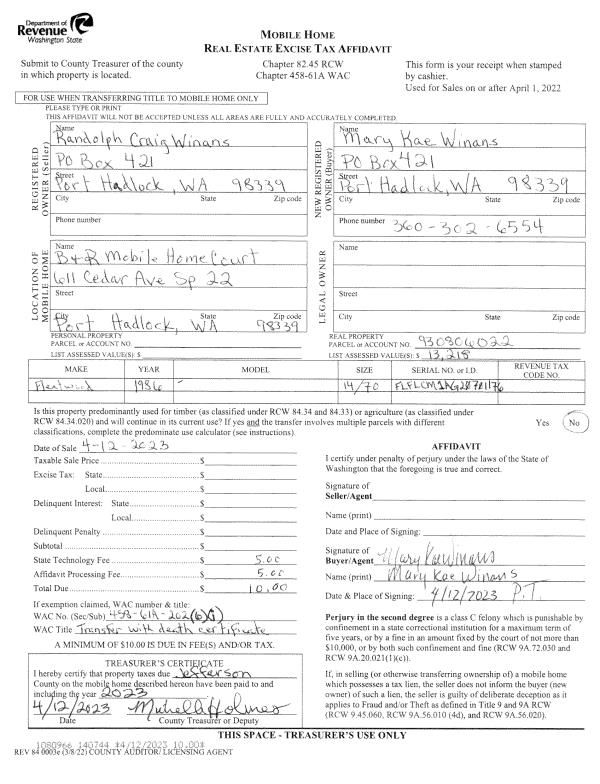 | Mailing Address: | 51 N MAPLE ST PORT HALDLOCK, WA 98339-9615 | % Ownership: | 100.0000000000% |