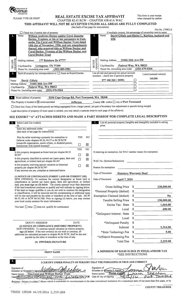| 1 | 10/27/2016 | SWD | Statutory Warranty Deed | LUCILLE M BROWN TRUST | ROBERT W MITCHELL | | | $192,625.00 | 126555 | |