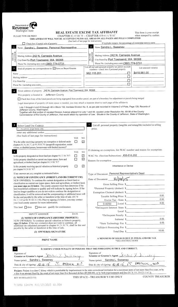 | 3 | 07/27/2016 | BSD | Bargain and Sale Deed | ECOTRUST FORESTS II LLC | CHIMACUM RIDGE LLC | | | | 125921 | |