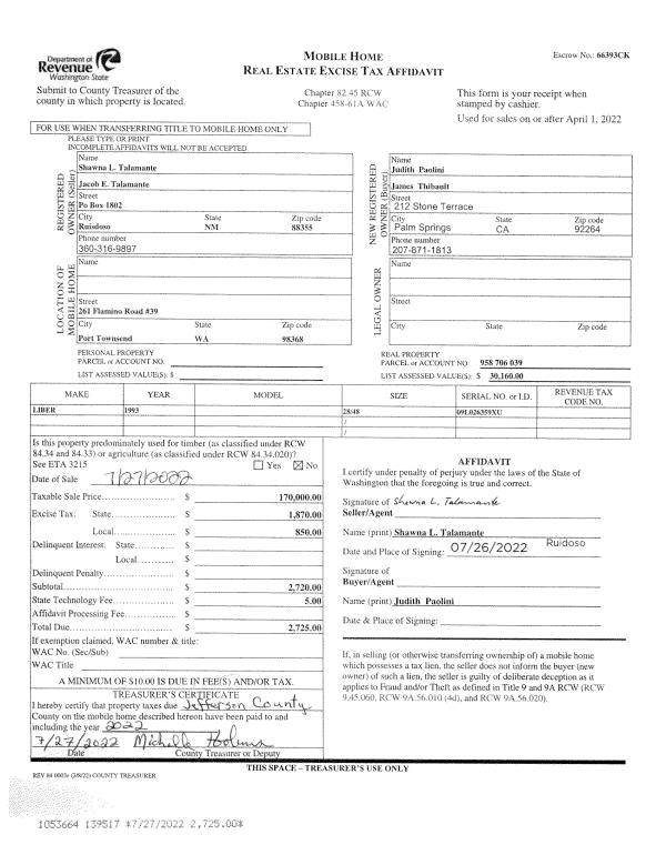 | Mailing Address: | JUNE A NIQUETTE LIVING TR 9/28/2022 C/O DENISE ELDRIDGE PO BOX 324 CHIMAUCM, WA 98325 | % Ownership: | 100.0000000000% |