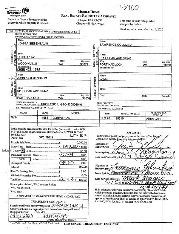 | 1 | 11/16/2020 | TMBD | Timber Only Deed | DAN E OVENELL TRUSTEE | NORTHWEST LOGGING CO LLC | | | $175,000.00 | 135607 | |