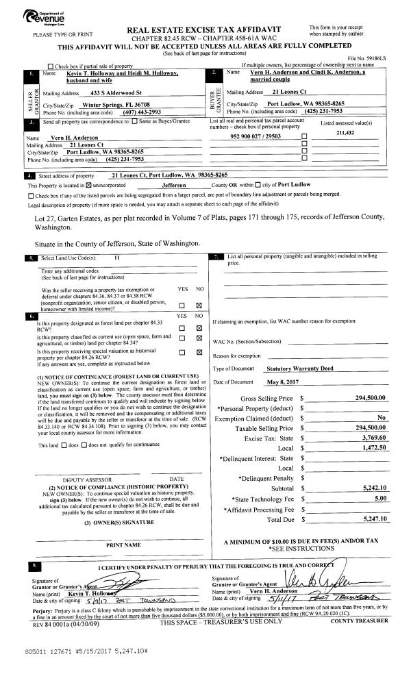| 1 | 07/26/2017 | SWD | Statutory Warranty Deed | PATRICIA M TERHELL | TIMOTHY S JACKSON | | | $393,000.00 | 128415 | |