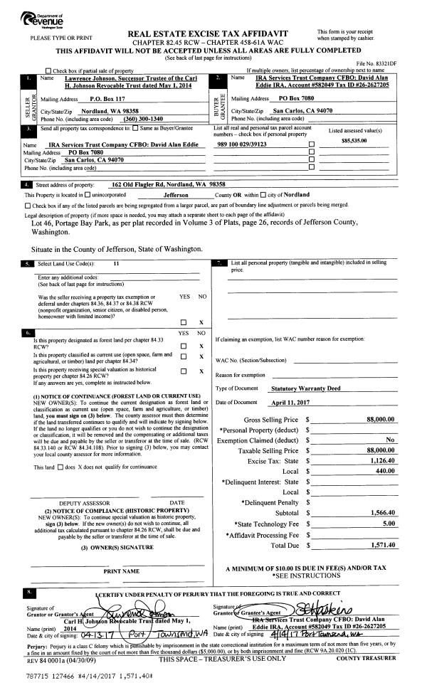 | 1 | 01/01/2018 | SWD | Statutory Warranty Deed | JAMES L BISHOP | JORDAN & ISABELLA COSSELL | | | $400,000.00 | 129329 | |