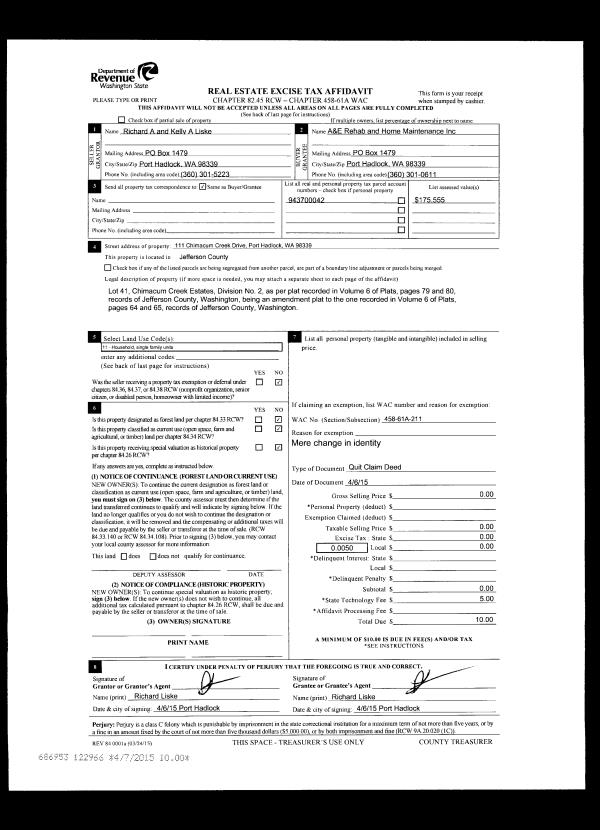| 4 | 05/03/2016 | QCD | Quit Claim Deed | | | | | | 125397 | |