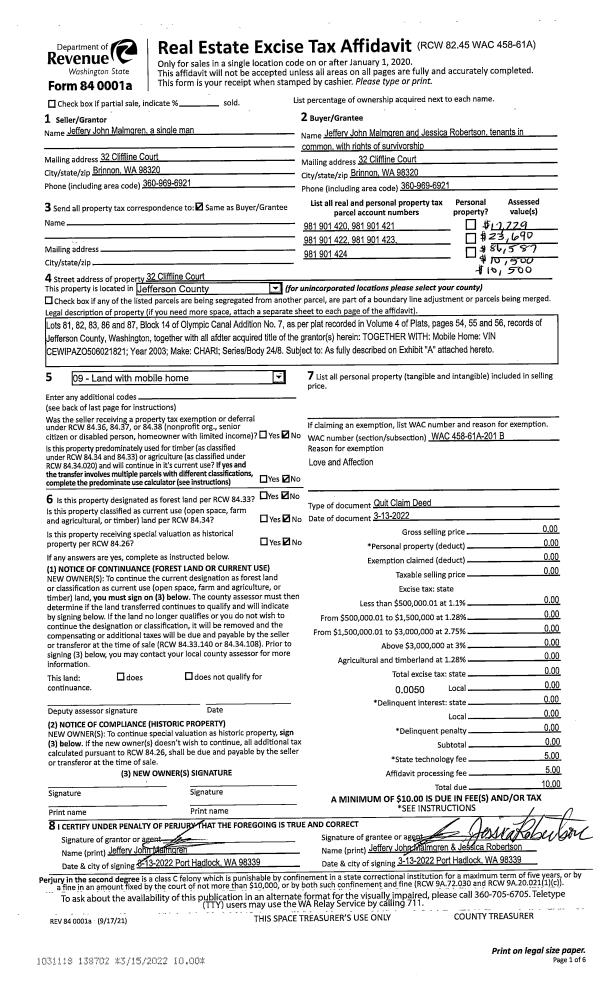 | 1 | 11/09/2020 | QCD | Quit Claim Deed | ELIZABETH H & SCOTT D RAY | ELIZABETH & SCOTT RAY LIVING TRUST | | | | 140431 | |