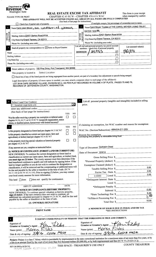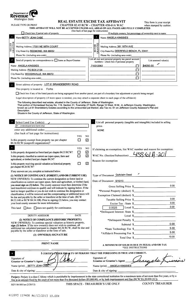 | 1 | 10/22/2013 | QCD | Quit Claim Deed | JUDY A PETERSON | JUDY ANN PETERSON REVOCABLE TRUST | | | | 120419 | |