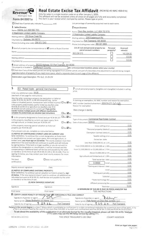 | Mailing Address: | 400 SENTINEL FIRS RD PORT HADLOCK, WA 98339-9736 | % Ownership: | 100.0000000000% |