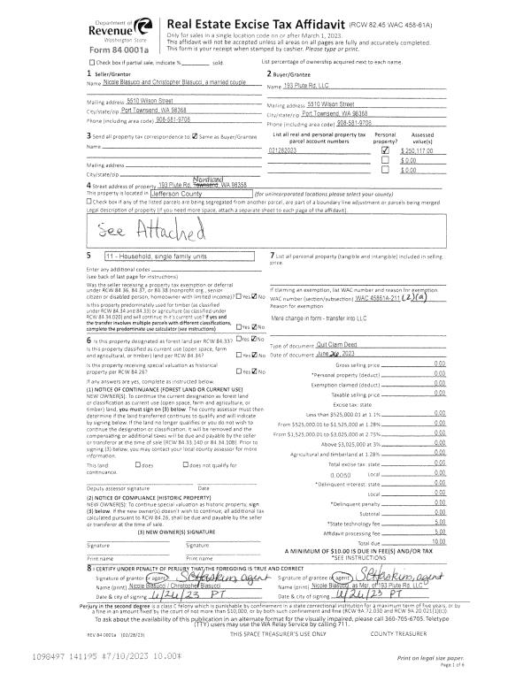 | 1 | 10/10/2023 | SWD | Statutory Warranty Deed | CARLA REAM | JUSTIN TAYLOR | | | $390,000.00 | 141738 | |