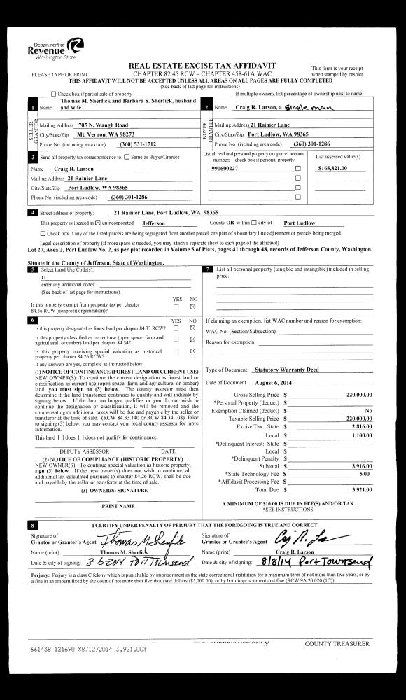 | Mailing Address: | 537 N BAY WAY PORT LUDLOW, WA 98365-9455 | % Ownership: | 100.0000000000% |