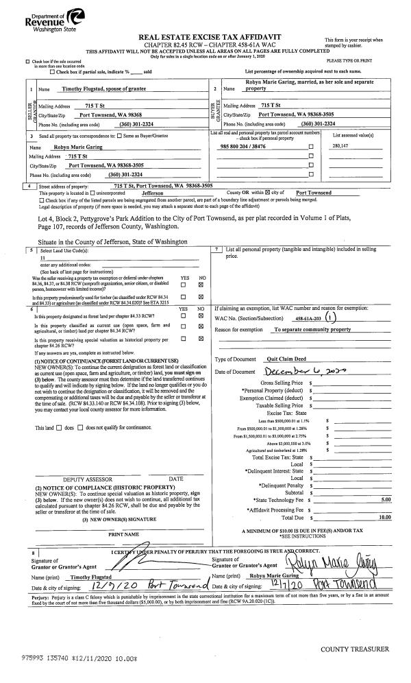 | 1 | 04/05/2021 | SWD | Statutory Warranty Deed | ALDEN B JOHNSON TRUSTEE | LIANN N & SCOT M HAGEY | | | $1,300,000.00 | 136468 | |