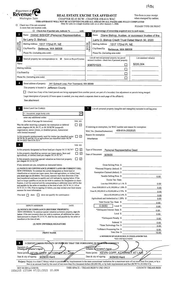 | Mailing Address: | CAVIN W RICHIE 6391 OAK BAY RD PORT LUDLOW, WA 98365-9409 | % Ownership: | 100.0000000000% |