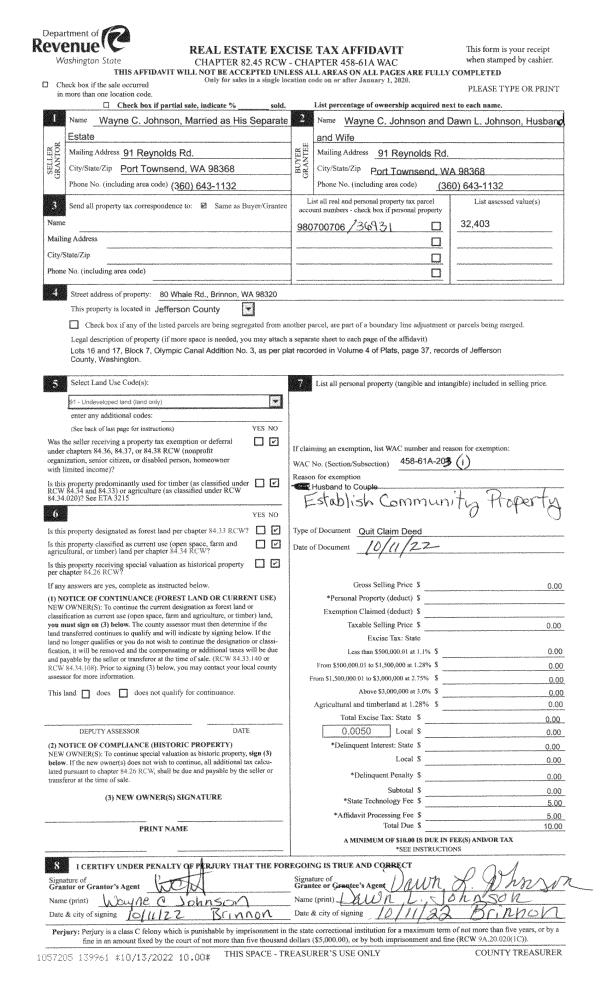 | Mailing Address: | 611 CEDAR AVE SPC 14 PORT HADLOCK, WA 98339 | % Ownership: | 100.0000000000% |