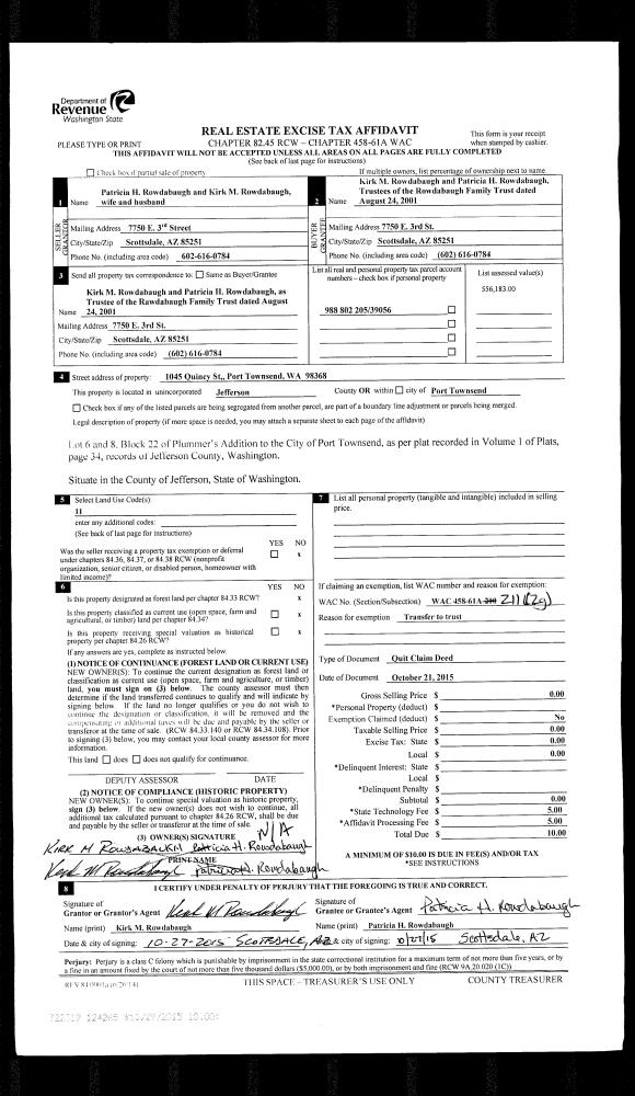 | 1 | 10/13/2016 | SWD | Statutory Warranty Deed | DANA L NIEMINEN | CITY OF PORT TOWNSEND | | | $5,000.00 | 126459 | |