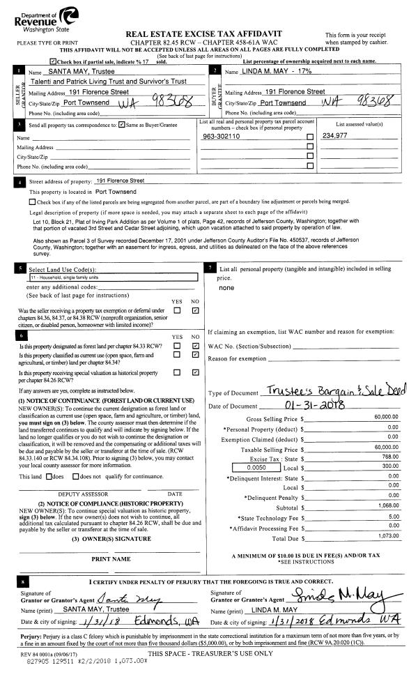 | Mailing Address: | 101 FIR CIR PORT HADLOCK, WA 98339-9592 | % Ownership: | 100.0000000000% |