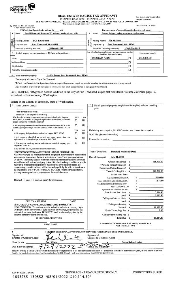| 5 | 08/22/2014 | SWD | Statutory Warranty Deed | PORT TOWNSEND ASSOCIATES | GRETCHEN M LAUBER | | | $295,000.00 | 121787 | |