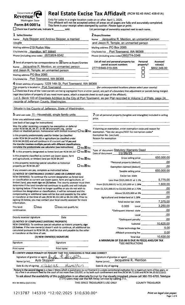 | 1 | 09/13/2022 | SWD | Statutory Warranty Deed | MICHAEL L & MAIA V MOUNTS | ANDREW ALEXANDER | | | $450,000.00 | 139808 | |