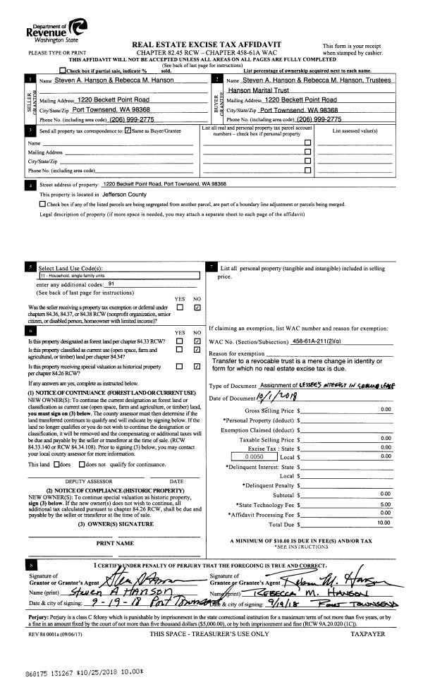 | Mailing Address: | PETER LEH TRUSTEE RENEE LEWIS TRUSTEE 1003 TREMONT ST PORT TOWNSEND, WA 98368-4029 | % Ownership: | 100.0000000000% |