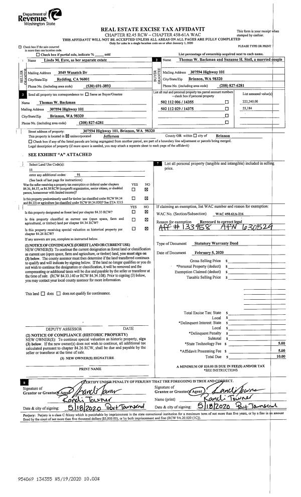 | 1 | 2555-6585Q | Commercial/Res. Frtg on US101 | 0.4400 | 19166.00 | 0.00 | 0.00 | 0.00 | $87,915 | $0 |