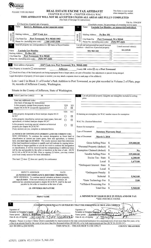 | 1 | 06/29/2015 | SWD | Statutory Warranty Deed | EDMOND BLAU | DWIGHT D BENSON & MING CHU BENSON | | | $345,000.00 | 123519 | |